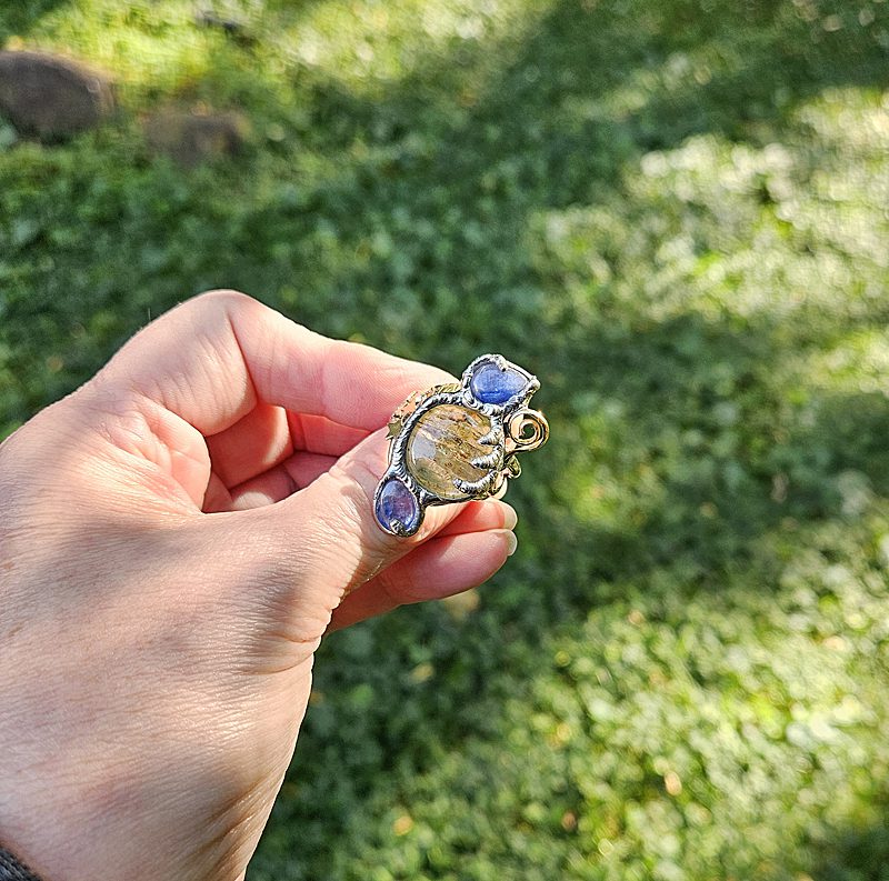This ring is Sterling Silver and 14 K Gold fill with Leaves and Stars for the embellishments.ย ย The stones are Two Blue Kyanites, one on each side of a Golden Labradorite.