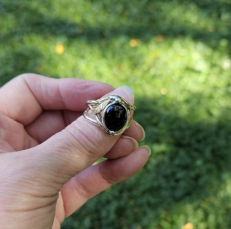 This ring is Sterling Silver and Gold with a Leaf embellishment.ย  The stone is Onyx.
