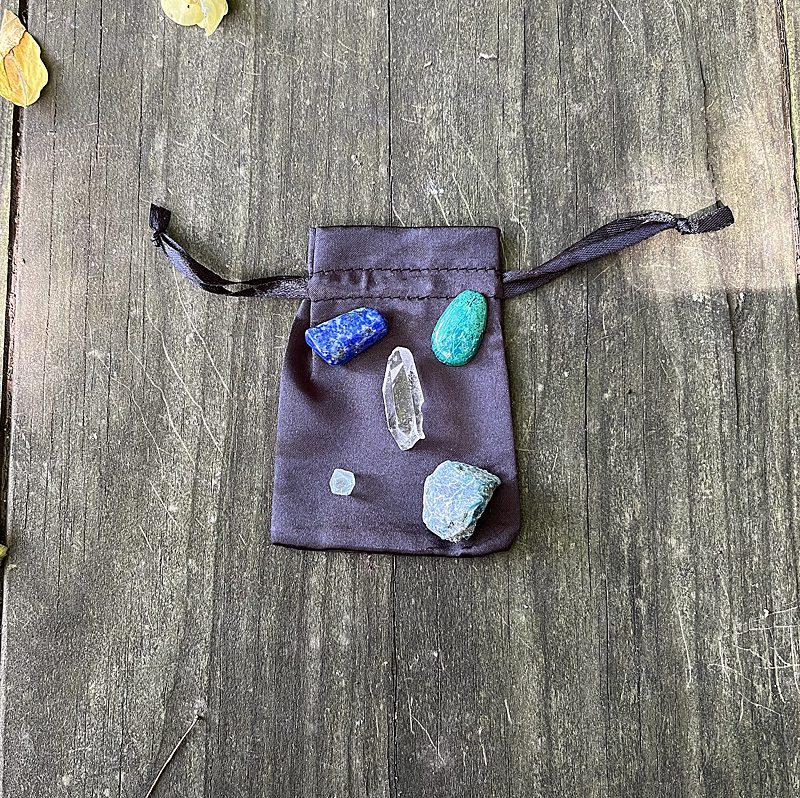 The stones that help with studying and concentration include Lapis Lazuli, Chrysocolla, Blue Apatite, Fluorite, and Quartz. The set includes the bag as well.